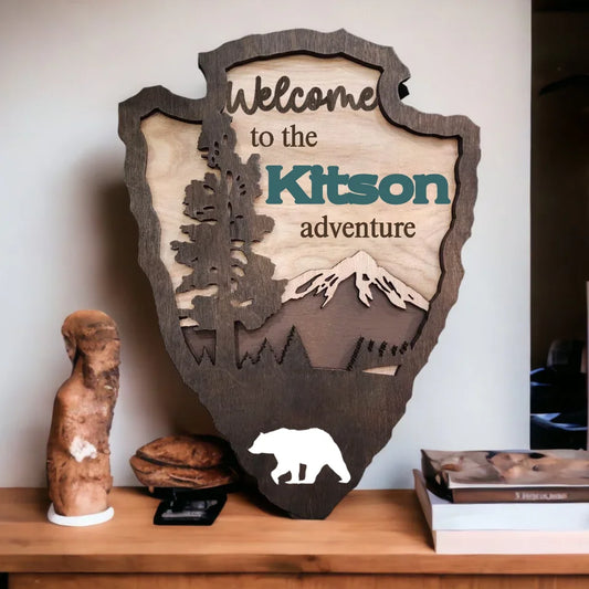 National Park Arrowhead Camping Campsite Family Sign with Hangers, Personalized Door Sign 2 Layer