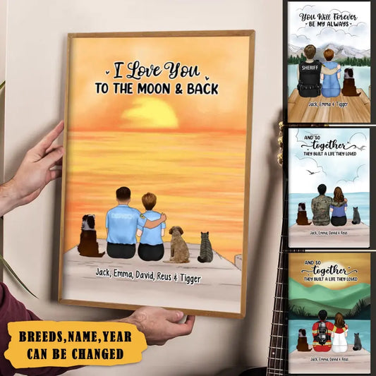 I Love You to the Moon and Back, Couple with Dog/Cat - Personalized Gifts Custom Poster for Couples, Nurse Gifts, Police Officer Gifts
