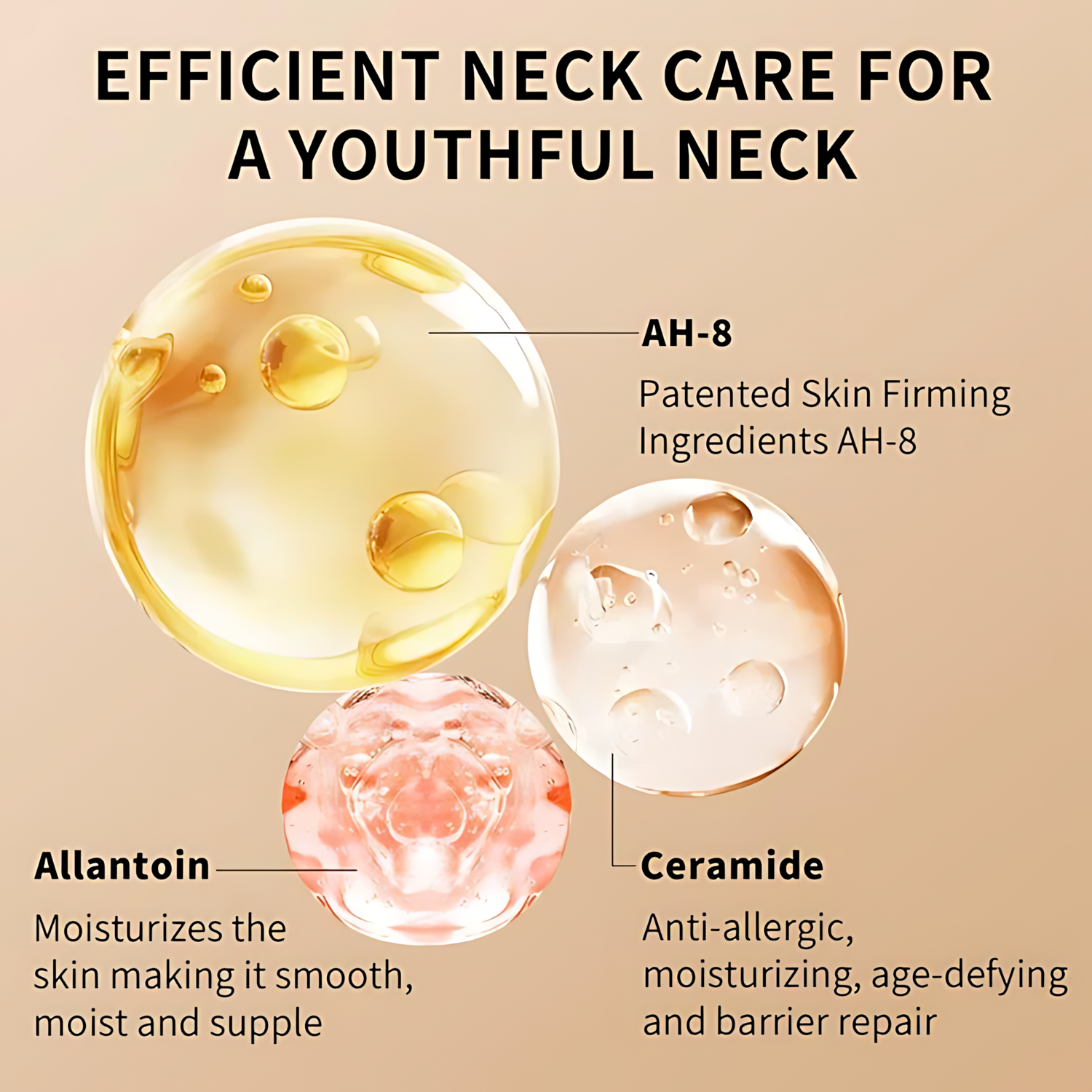 Elevate your neck care routine with a concentrated formula powered by AH-8, ceramides, and allantoin. This blend targets wrinkles and fine lines for a smoother, younger-looking neck. The 360° roller massager boosts absorption and stimulates circulation, delivering a soothing, spa-like treatment that leaves skin firm, hydrated, and refreshed.