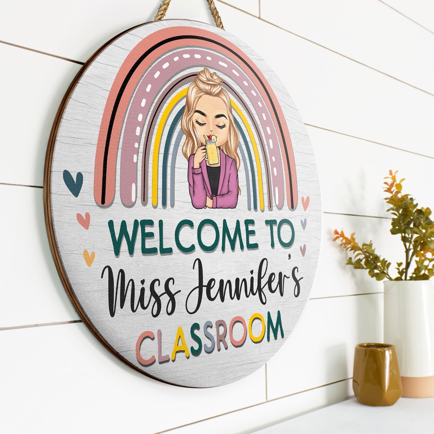Rainbow Welcome To Teacher Classroom - Gift For Teachers, Classroom Door Sign - Personalized Custom Wood Circle Sign